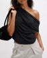 Draped to perfection, the off the shoulder top is featured in the perect slinky jersey fabric. Fits relaxed and drappy.